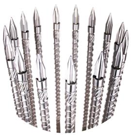 全硬螺桿Fully hardened screw HPT1螺桿 HPT1耐磨型適用15%玻璃纖維、電木、電動注塑機等; HPT2螺桿 HPT2耐腐蝕適應(yīng)范圍:耐高溫、耐高速、PC+玻璃纖維、尼龍+玻璃纖維; HPT3螺桿 HPT3適用不粘性、腐蝕性、耐磨性,范圍:磁粉、陶瓷粉、鋁鎂粉、鐵粉、銅粉; HPT5無鹵螺桿 HPT5適用粘性、腐蝕性、耐磨性。 以上四種材料(在國外稱全硬螺桿)代替原雙金屬螺桿,并已在國外被廣泛應(yīng)用。